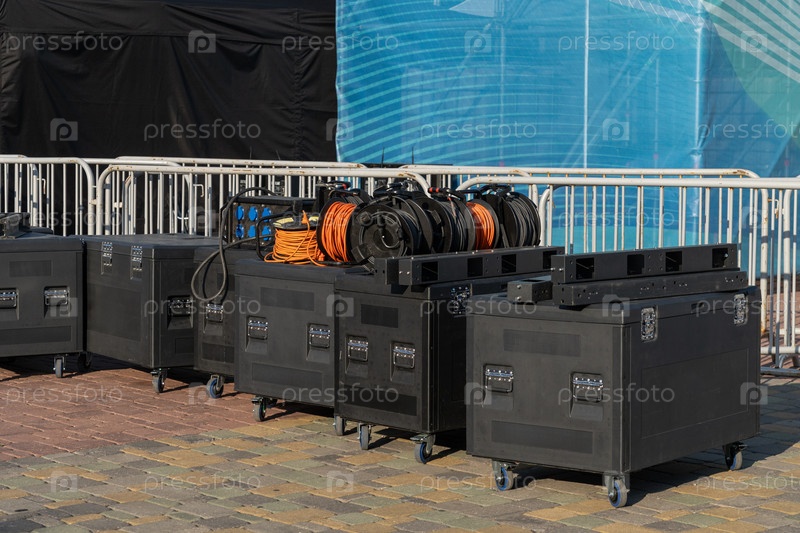 Коробки оборудования на музыкальной сцене для монтажа светодиодного экрана. кабели, панели, запасные части готовы к установке на открытом воздухе