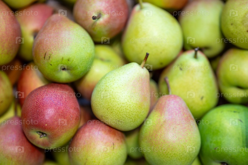 Фон спелых груш, лежащих на деревянной поверхности. Свежий урожай фруктов, здоровая еда натюрморт. Плоский вид сверху
