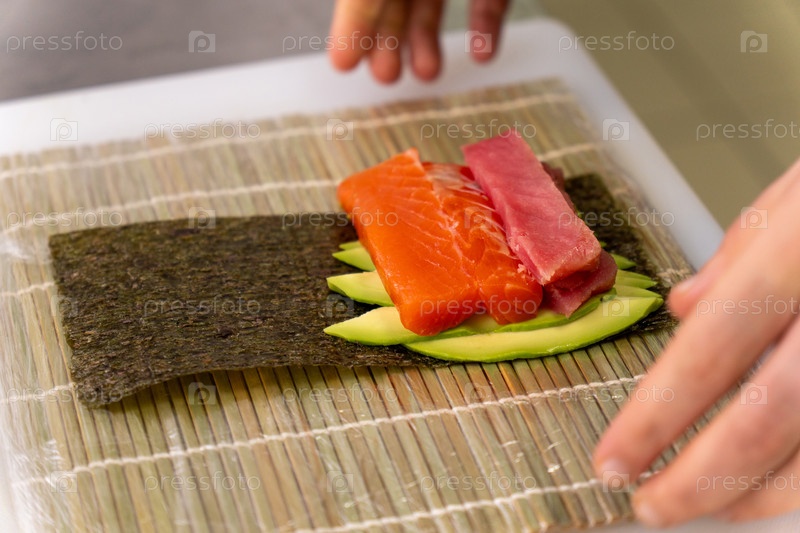 Руки шеф-повара суши умело готовят свежий лосось, тунца и авокадо с высокой точностью