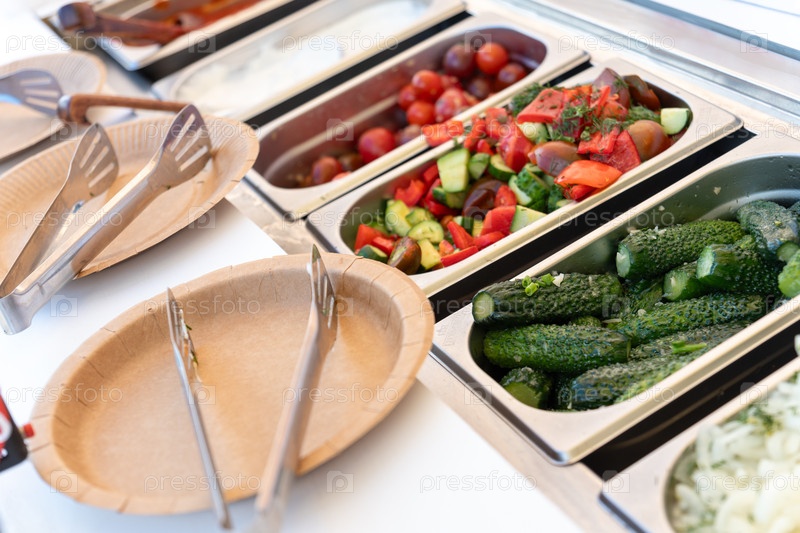 Свежие овощные салаты, маринованные огурцы и помидоры и другие закуски на столе буфета. самообслуживание с щипцами и одноразовыми картонными тарелками