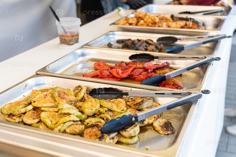 Пикантные блюда из выпеченных овощей на буфете: жареные кабачки, перцы и баклажаны подаются в подносах с щипцами для самообслуживания