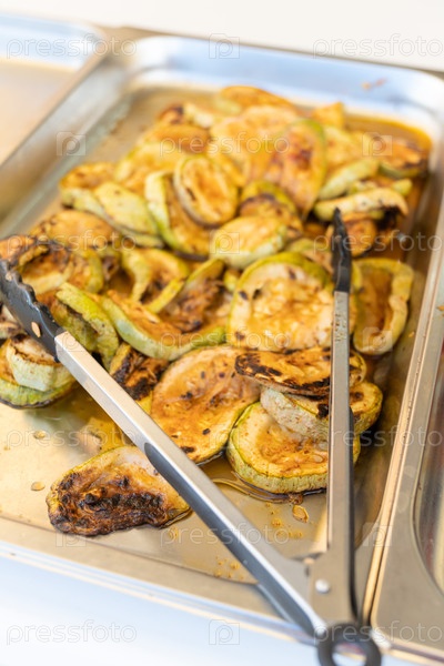 Запеченные цуккини на угольном гриле подают на тарелке для шведского сморгасборда