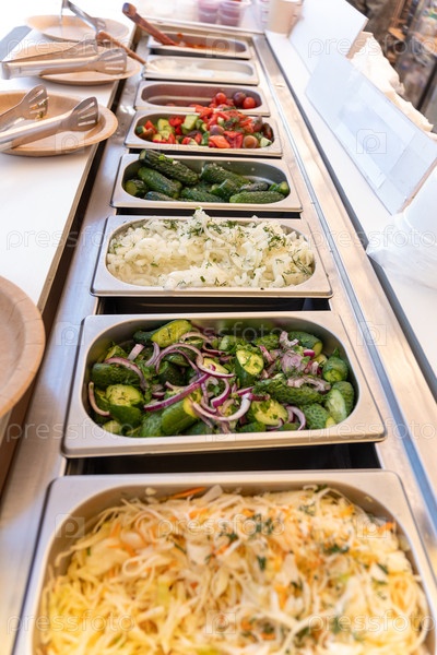 Разнообразные свежие овощные салаты, маринованные огурцы, помидоры, лук, уксус и другие закуски для буфета. самообслуживание с щипцами и одноразовыми тарелками