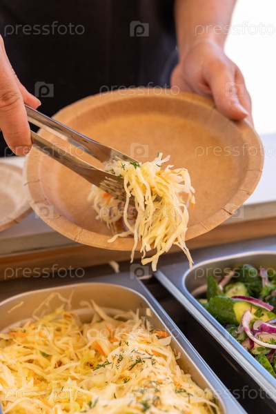 Посетитель подает салат с кислой капустой из буфета в современном кафе самообслуживания