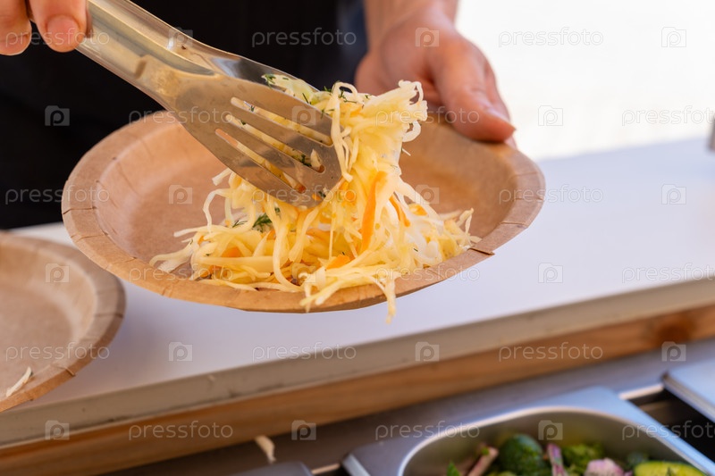 Посетитель подает салат с кислой капустой из буфета в современном кафе самообслуживания
