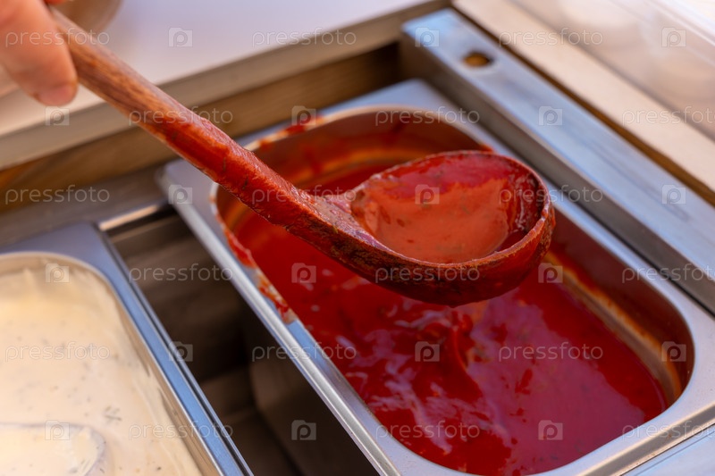 Посетитель собирает свежий томатный соус из контейнера с помощью деревянного ведра, подчеркивая рустическую кухню и приготовление пищи