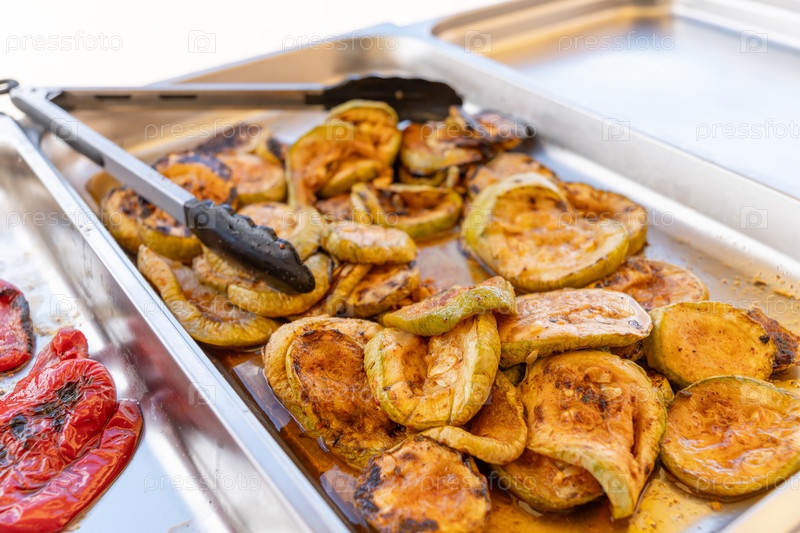 Угольная обжаренная запеченая кабачка подается на тарелке для шведского смаргасборда
