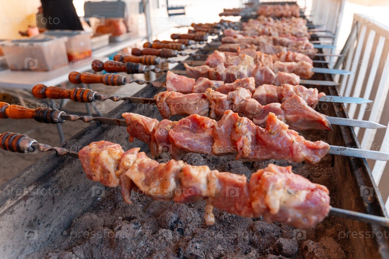 Высушивающие шишки маринованного мяса, жареного на горячих углях в оживленном фестивале уличной еды
