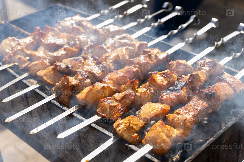 Сочный шиш-кебаб, жаренный с помощью древесного угля на открытом воздухе в солнечный летний день