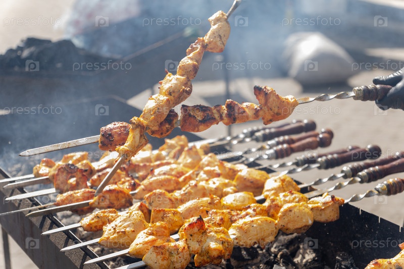 Сочный шиш-кебаб, жаренный с помощью древесного угля на открытом воздухе в солнечный летний день
