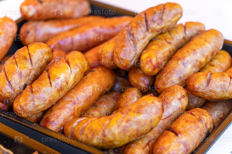 Поднос с жареной колбасой из уличного кафе самообслуживания