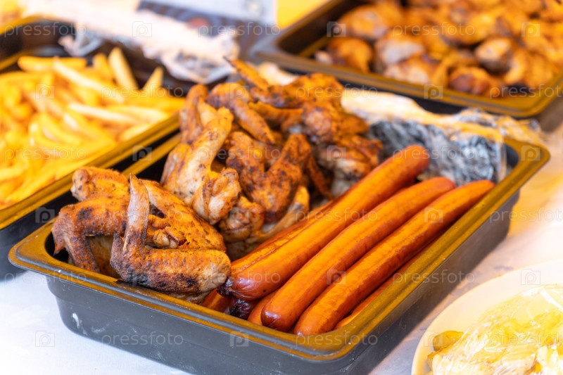 Жареные куриные крылья, колбасы и картофель фри подаются на металлических подносах в оживленном уличном кафе, которое можно взять с собой