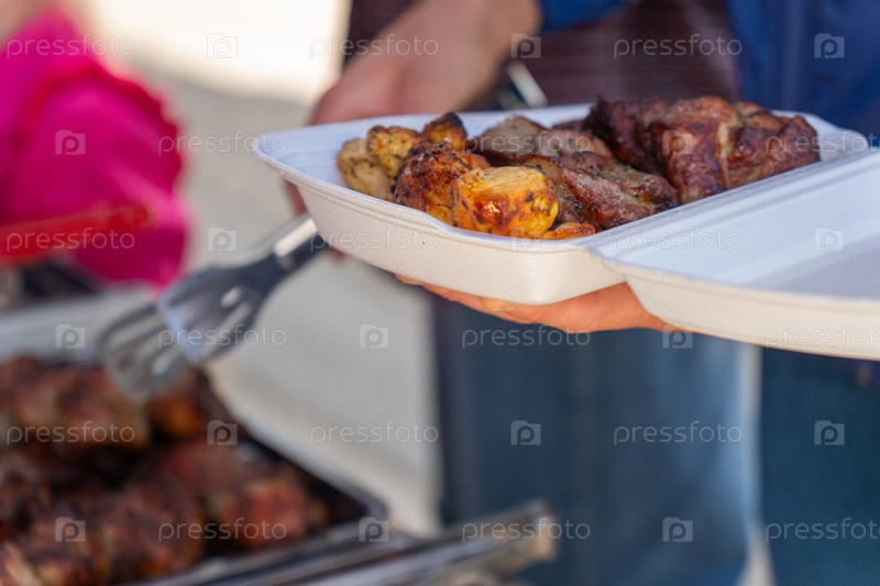 Рука использует щипцы, чтобы поместить жареное мясо в контейнер для пена на барбекю