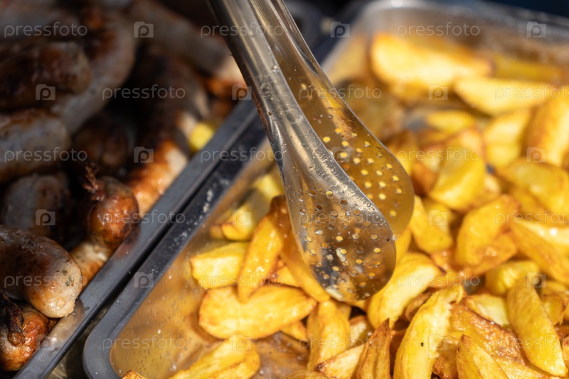 Свежежареные картофель фри подаются с щипцами на металлической подносе, готовой к употреблению в пищу
