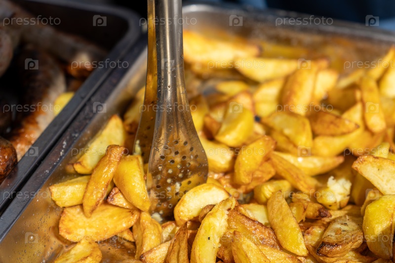Свежежареные картофель фри подаются с щипцами на металлической подносе, готовой к употреблению в пищу
