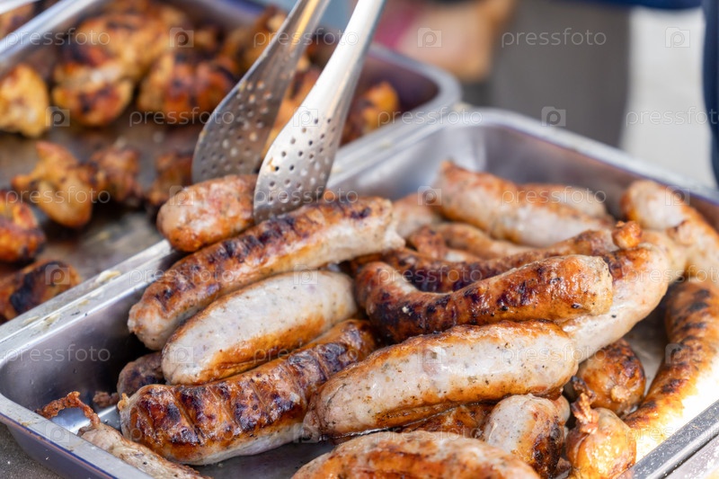 Празднование сисящей уличной еды: жареные колбасы, кебаб и золотые картофель