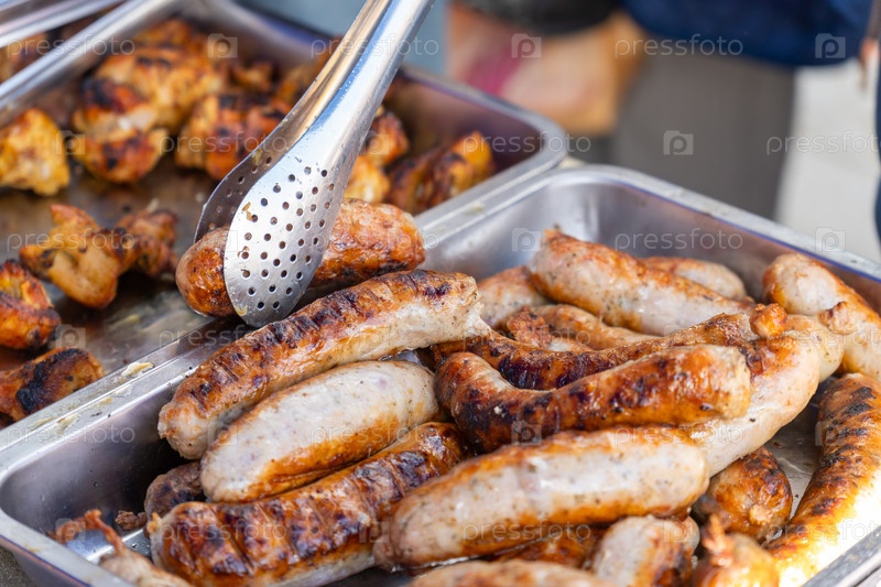 Праздничная уличная еда: жареные колбасы, кебаб и золотые картофель фри в контейнерах на вынос в ресторане под открытым небом