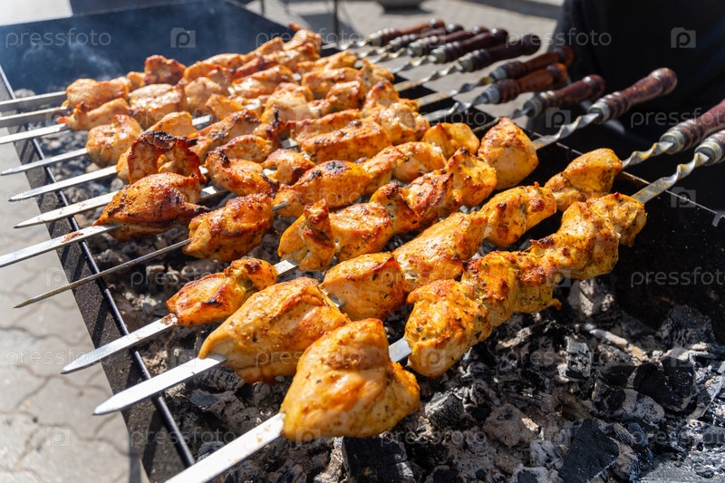 Сочный шиш-кебаб, жаренный с помощью древесного угля на открытом воздухе в солнечный летний день