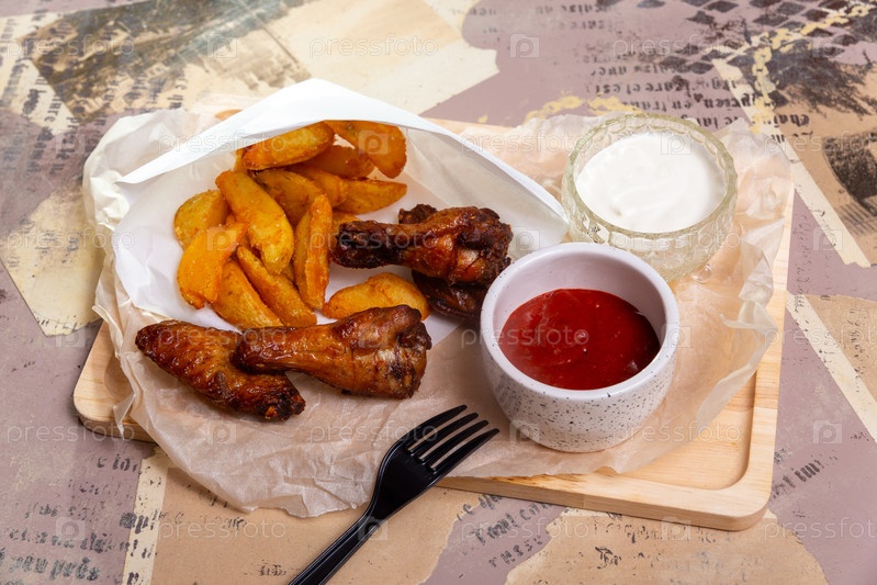 Хрустящие жареные цыпленочные ножки и золотые картофель фри подаются с кетчупом и чесночным айоли на деревянной доске