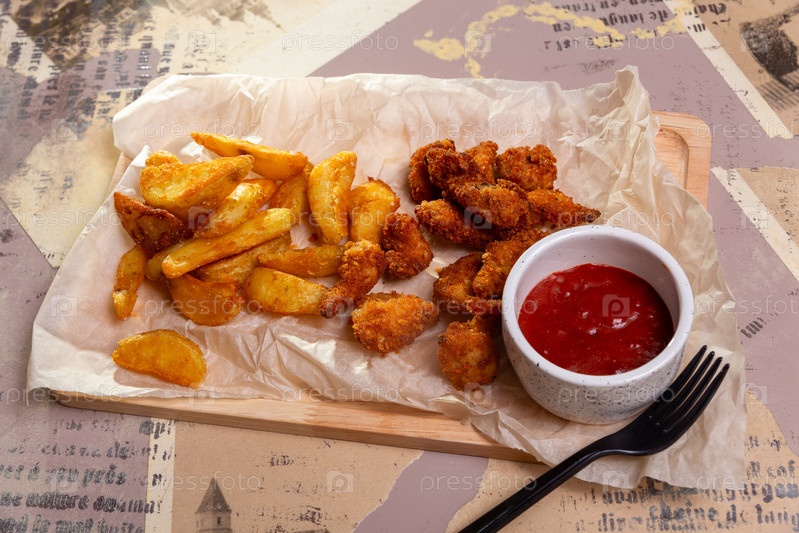 Хрустящие куриные наггетсы и кетчуп-фри подаются на деревянной доске с ремесленной бумагой и пластиковой вилкой