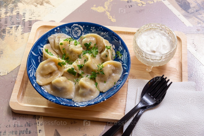 Тарелка русских пельменей с кислой смесью и свежим укропом на деревянной доске, подаваемой на бумаге
