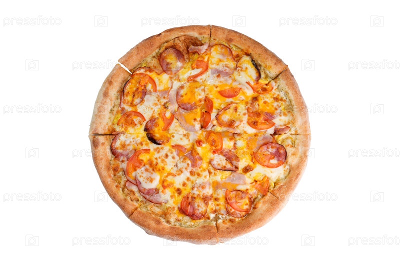 Вкусная пицца с пепперони со беконом и помидорами, изолированная на белом фоне