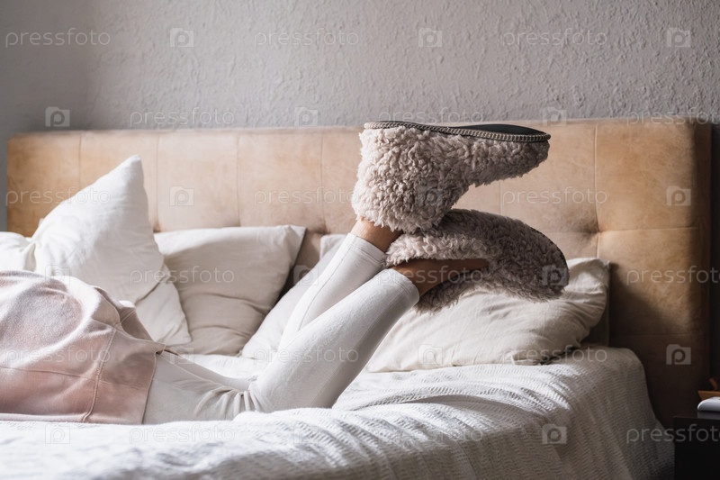 Мужчина, лежащий на кровати с поднятыми ногами и в шерстяных тапочках