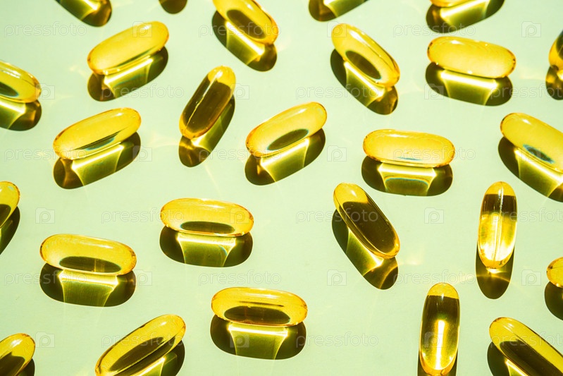 Желтые полупрозрачные витаминные капсулы размещаются на зеленом фоне и бросают тени