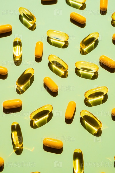 Капсулы и гелевые таблетки на зеленом фоне с твердыми тенями
