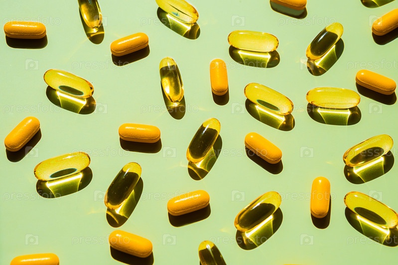 Капсулы и гелевые таблетки на зеленом фоне с твердыми тенями