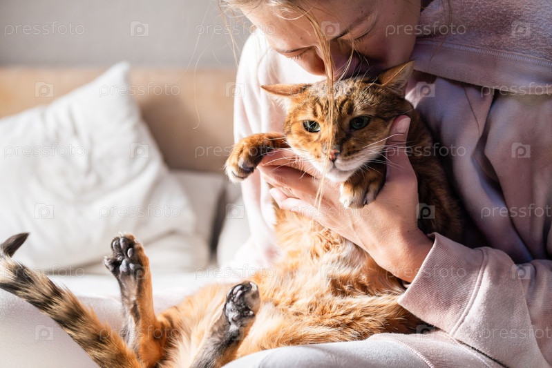 Мужчина обнимает кота на кровати в уютной домашней среде