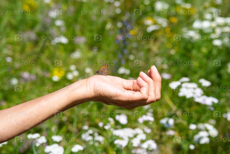 Пожилые самки держат бабочку на поле с цветущими дикими цветами