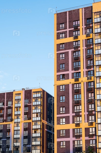 Высокие жилые здания с красочными фасадами во время захода солнца