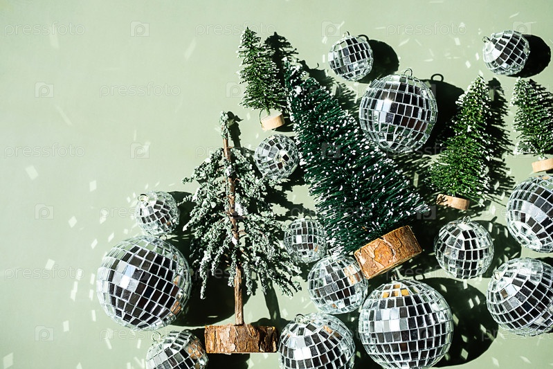 Крошечные рождественские деревья и украшения блестящие и искрящиеся. праздничное и веселое настроение