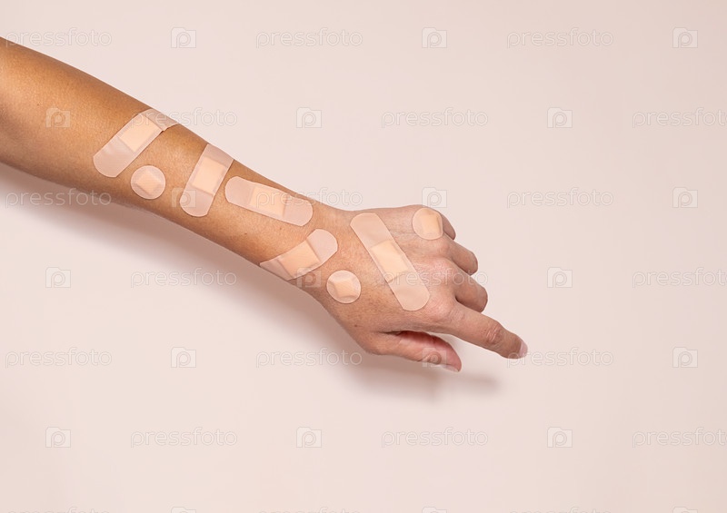 Человеческая рука покрыта различными клеевыми бинтами
