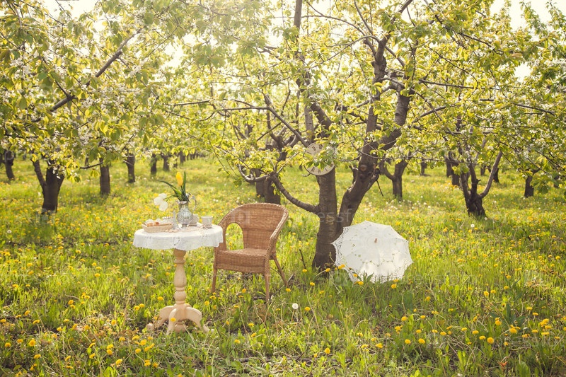 Романтический пикник в весеннем саду. Декорации для фотосессии в цветущем яблоневом огороде. Кофейный стол, наполненный чашками, конфетами, выпечкой и вазой тюльпанов, плетеновый стул, кружевный зонтик