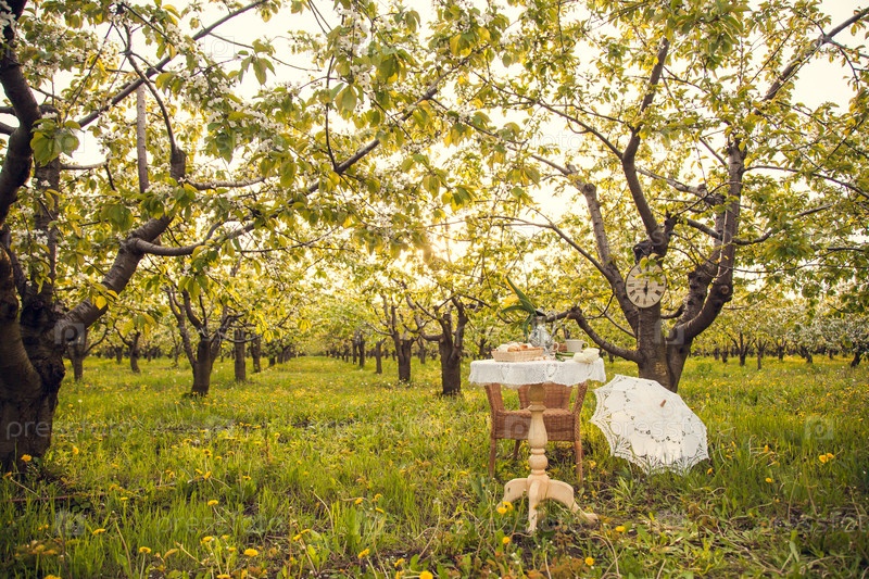 Романтический пикник в весеннем саду. Декорации для фотосессии в цветущем яблоневом огороде. Кофейный стол, наполненный чашками, конфетами, выпечкой и вазой тюльпанов, плетеновый стул, кружевный зонтик