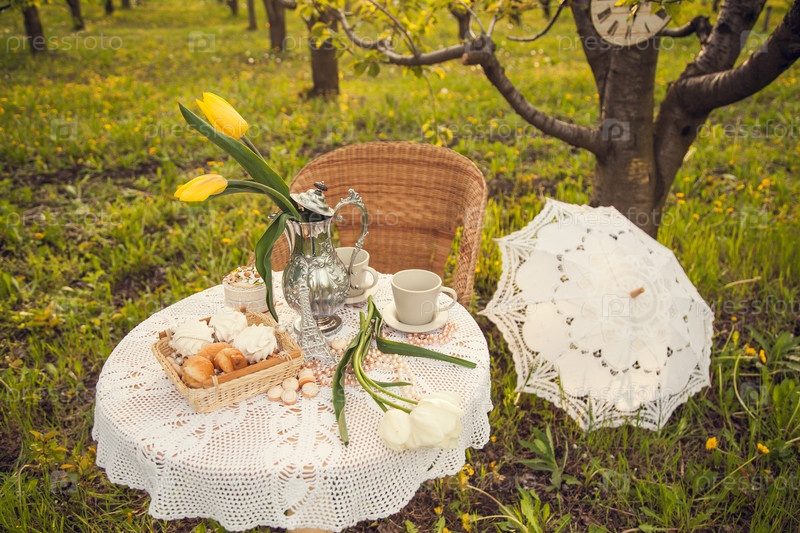 Романтический пикник расцветает в весеннем яблочном саду. кофейный стол с чашками, конфетами, выпечкой и вазой тюльпанов