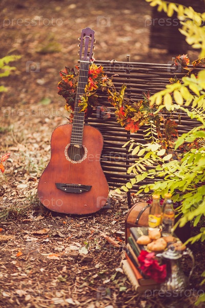 Осенний пикник в парке. гитара стоит возле плетенового забора, переплетенного с осенними листьями