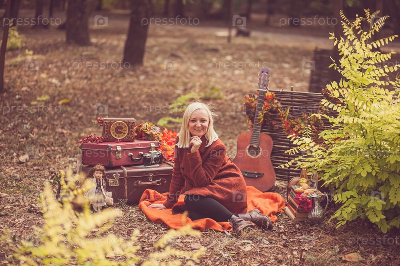 Появление молодой блондинки в оранжевом осеннем пальто, сидящей на оранжевой клетке с улыбкой на лице
