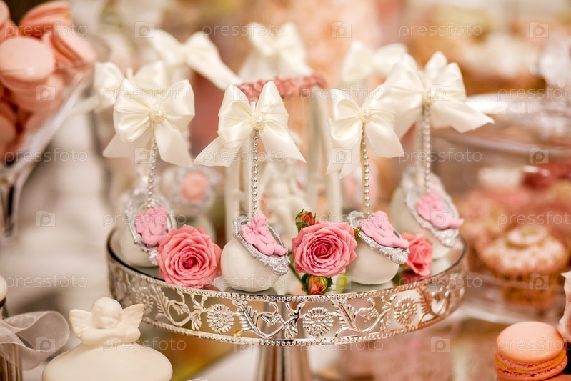 Вкусные десерты в свадебном кондитерском баре в буфетной зоне: торты, украшенные ангелами, камео и свежими розами