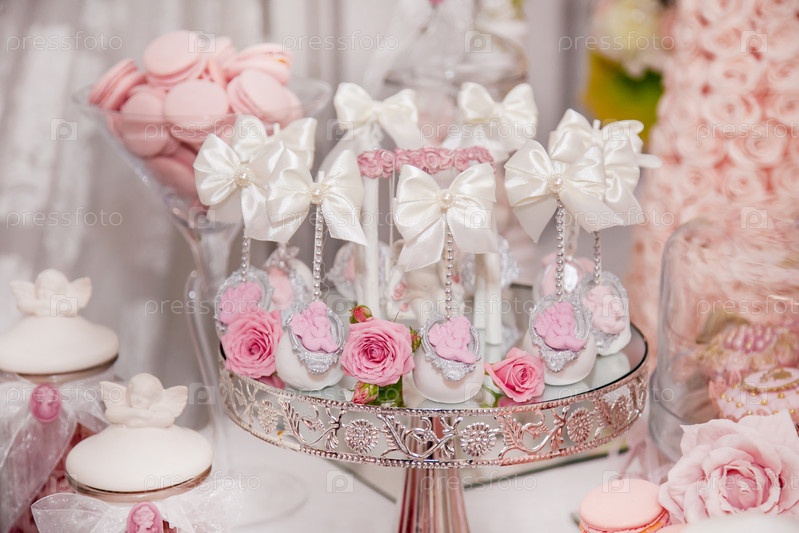 Вкусные десерты в свадебном кондитерском баре в буфетной зоне: торты, украшенные ангелами, камео и свежие розы