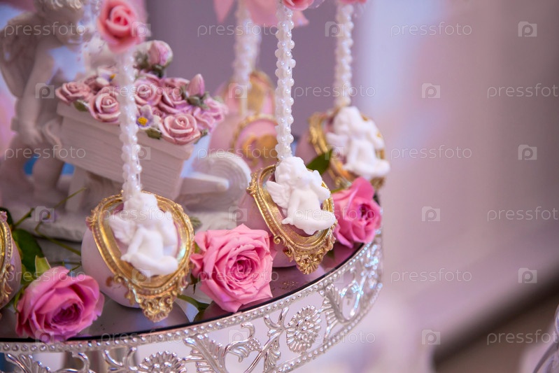 Вкусные десерты в свадебном кондитерском баре в буфетной зоне: торты, украшенные ангелами, камео и свежие розы