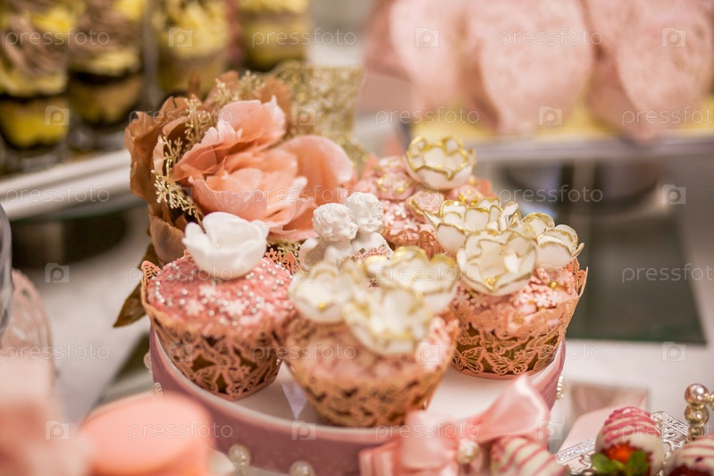 Вкусные десерты в свадебном конфет-баре в зоне буфета: кексы, украшенные ангелами, сахарные пузыри и золотой краситель