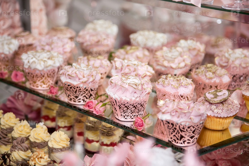 Вкусные десерты на свадебном конфет-баре в зоне буфета: кексы, украшенные ангелами, розовые сахарные пузыри и золотая краска