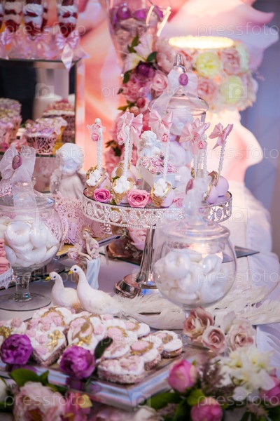 Вкусные десерты в свадебном кондитерском баре в буфетной зоне: торты, украшенные ангелами, камео и свежие розы