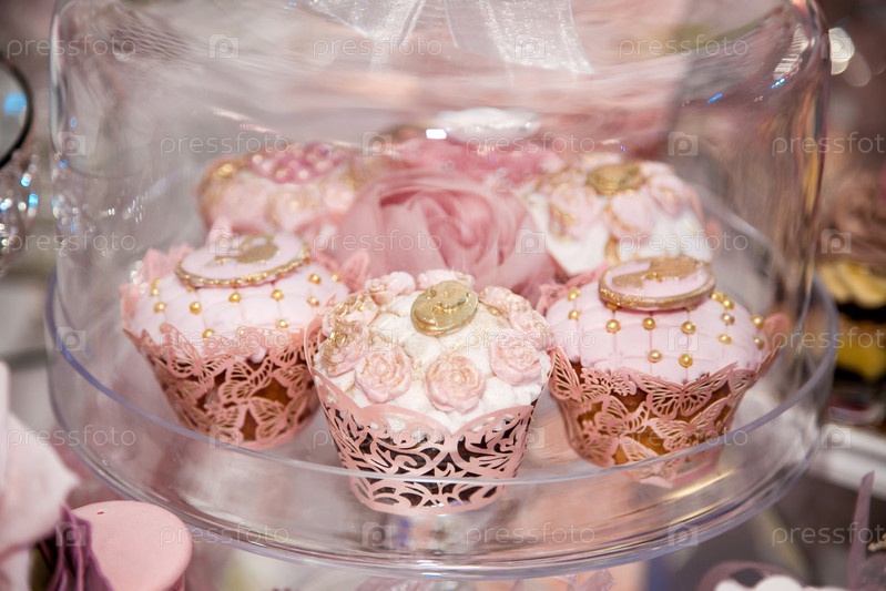 Вкусные десерты на свадебном конфет-баре в зоне буфета: кексы, украшенные ангелами, камео, розовые сахарные пузыри и золотая краска