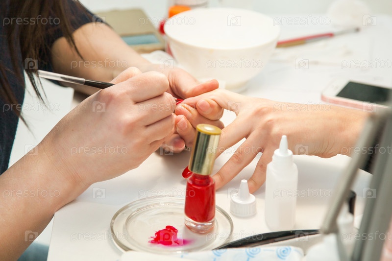 Гель - это польский дизайн. мастерница в салоне рисует кистью на руках клиента. индустрия красоты, концепция творчества