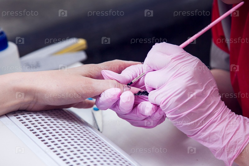 Гель - это польский дизайн. мастерница в салоне рисует кистью на руках клиента. индустрия красоты, концепция творчества