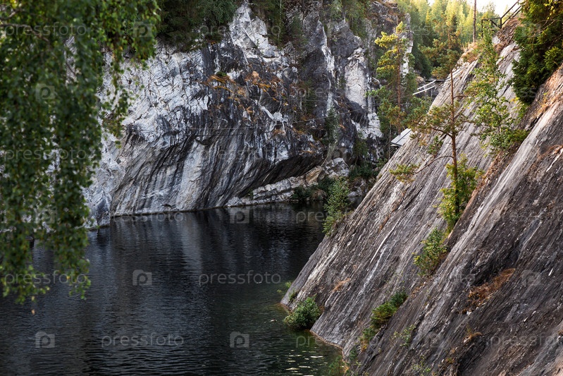 Летний пейзаж горного парка Рускеала. Бирюзовый и мраморный каньон летом. Россия, Республика Карелия, деревня Рускеала
